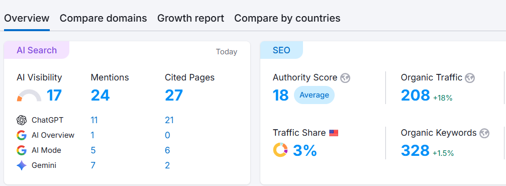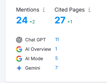 Generated 24 total AI mentions and 27 cited pages, demonstrating comprehensive content coverage and multi-page authority establishment across AI platforms